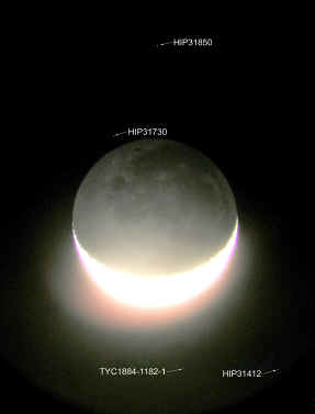 In the evening of May 15, 2002, I was rather preoccupied with the planets and almost missed the occultation of small stars by the Moon with beautiful Earthshine. The two lower stars, HIP31412 and TYC1884-1182-1, must have gone through earlier. I did visually catch the blinking away of HIP31730 just around 9:30 local time, which always is an instantly rewarding experience for me. By the time HIP31850 was to disappear, the battery in my camera died! So, this time I just ended up with the have been and will be occulted stars!