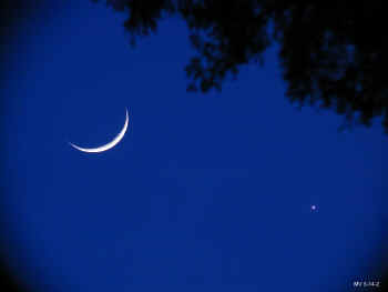 On May 14, another visitor joined the dance: the crescent new moon. So we have here an even more spectacular conjunction of the moon and the planets, with the moon nestled right between Venus and Mars.