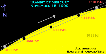 According to the RASC Observer's Handbook for 1999, page 177, the times for the Transit of Mercury on November 15 are as follows. All times are UT. Please adjust for your local time zone. These times are valid for the area of the center of the region of visibility.