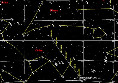 In mid-March, Ikeya-Zhang stood well up in the west as darkness fell in the constellation Pisces. Doug reported another observation on March 10th. "2002 C1 was observed last night. Very impressive through the binoculars. With averted vision, the tail stretched beyond the 5 degree FOV. The coma was small, only a few arc minutes, but it was quite bright. The pseudo nucleus appeared to be at least 4th magnitude, maybe brighter. Through the 4-inch at 25X, quite a bit of fine structure was seen in the tail within 2 degrees of the coma."