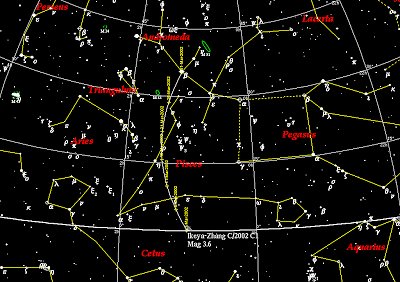 Comet Ikeya-Zheng was discovered February 1, 2002, by Japanese observer Kaoru Ikeya and Chinese amateur Zhang Daqing. At time of discovery, the comet was visible in binoculars from dark-sky locales near the stars Beta and Iota Ceti, which define the "head" of Cetus, the Whale. The comet was about 8th magnitude in brightness.