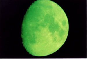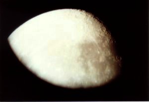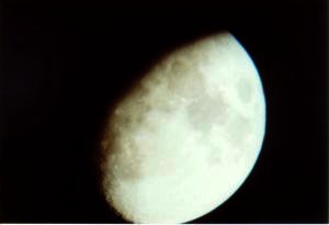 I used my Canon FTb with a 50mm lens and Polaroid 400 speed film. Eyepieces were a 25 mm (48x) and a 15mm (82x). Also I did a shot with my moon filter, which made a pretty "green moon." The camera settings I used were focus at infinity with a 1/8 second shutter speed.