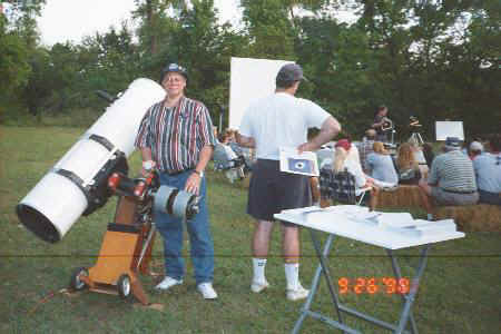 AAAA Vice-President Ed Flaspoehler stands by his 12-inch f/5 Big Foot Newtonian telescope, awaiting his turn as speaker at the North Texas Skywatch Star Party on September 26. Texas amateur Preston Starr can be seen in the background giving his talk on astrophotography. AAAA promotional material is on the table ready for distribution. Local star parties and public observing sessions are a good way to get the word out about the AAAA. Become the Astronomy Expert in your local area. Please let us know if you need any materials or help on a presentation. AAAA Attends North Texas SkywatchThe 2nd Annual North Texas Sky Watch was held on September 26, 1998, at Cleburn State Park, south of Ft. Worth, TX. Over 300 amateur astronomers and the general public attended this event, which is organized each year by Michael Hibbs of Ft. Worth. Michael is an astronomy instructor at Tarrant County Junior College. The North Texas Skywatch's Amateur Astronomer's Star Party is designed for the amateur astronomers in the DFW area to get together and share ideas and experiences, learn new techniques, swap equipment, test out new equipment, and observe in a dark sky location, all within an easy drive from the Metroplex. The Star Party is also for those novices who are curious and want to learn more about astronomy, or want to have a chance to see the night time skies in a dark location through a wide variety of telescopes. Starting at 4:00 PM, there was an open swap meet for amateur astronomers to sell and buy astronomical related goods, a new telescopes and accessories display, information on local college and university astronomical programs, and information on local astronomy and science clubs. Local astrophotographer Preston Starr presented an astrophotography seminar entitled Backyard Tripod to Telescope and CCD: Affordable Applications for the Amateur Astronomer At 7:30, AAAA Vice-President Ed Flaspoehler presented a 30 minute slide show, Introduction to Late Summer Deep Sky Objects. The talk discussed representative deep sky objects visible that night, including a globular cluster, M13 in Hercules, a planetary nebular, M57 in Lyra, open clusters M6 and M7 in Scorpius, emission nebulas M8 and M20 in agittarius, and a galaxy, M31 in Andromeda. The beautiful double star gamma Andromedae was also included. Ed’s talk covered not only pictures of the deep sky objects, but also showed how to find the objects on star charts handed out to audience members before the show. Ed also make a brief mention of the mythological background of each constellation. To end the scheduled activities, organizer Michael Hibbs awarded a valuable door prize: Starry Night Deluxe Astronomy Software for Windows and Mac, donated by Sienna (value of $89.95). To close out the evening, Mike then made a presentation called Intro to Astronomy for the Novice and Curious. Starting at 9:00 pm, the attendees were treated to open telescopic observations and given help with constellation identification. Due to the clear skies, pleasant temperatures, and steady seeing, the event lasted well past midnight.